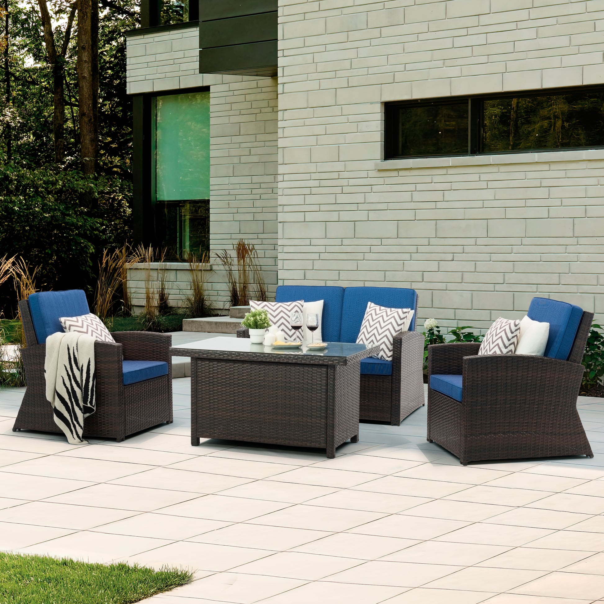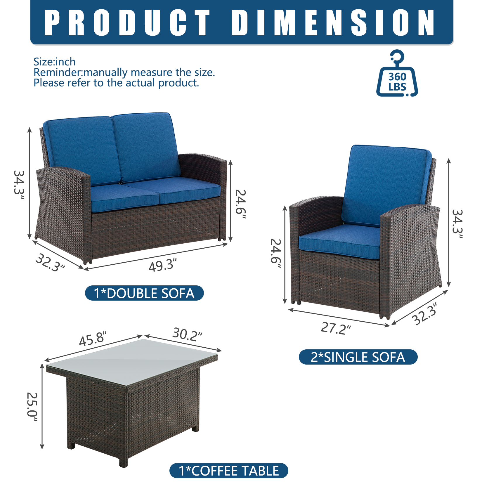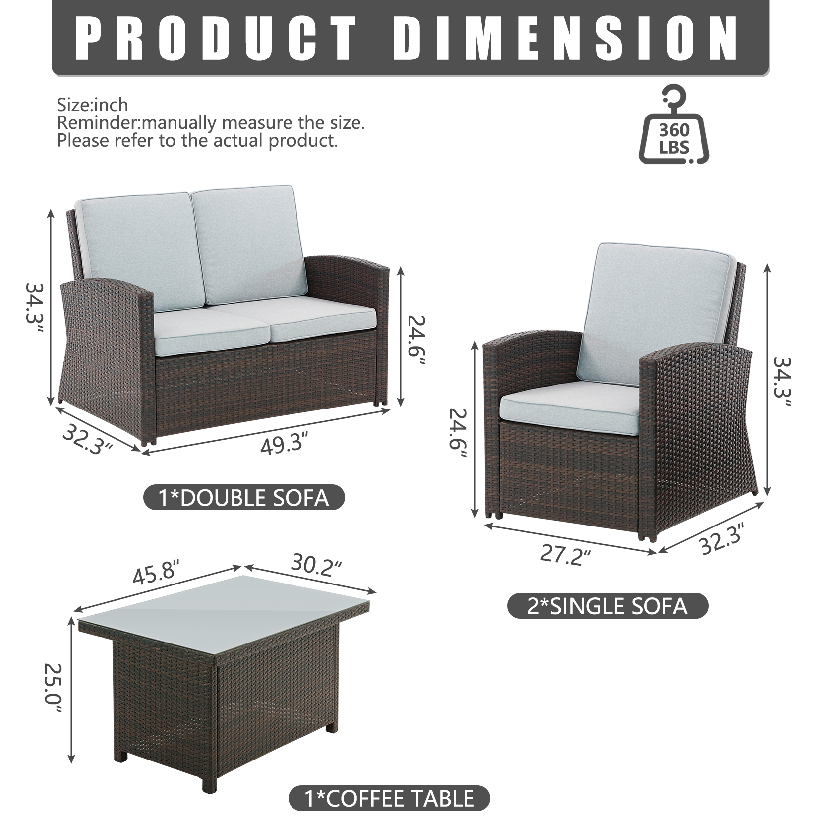 • [4 Pieces Set Includes] - It comes with 2 x armchairs, 1 x loveseat,1 x Rattan Wicker  table,1 x tempered glass top and 8 x cushions (Assembly Required)