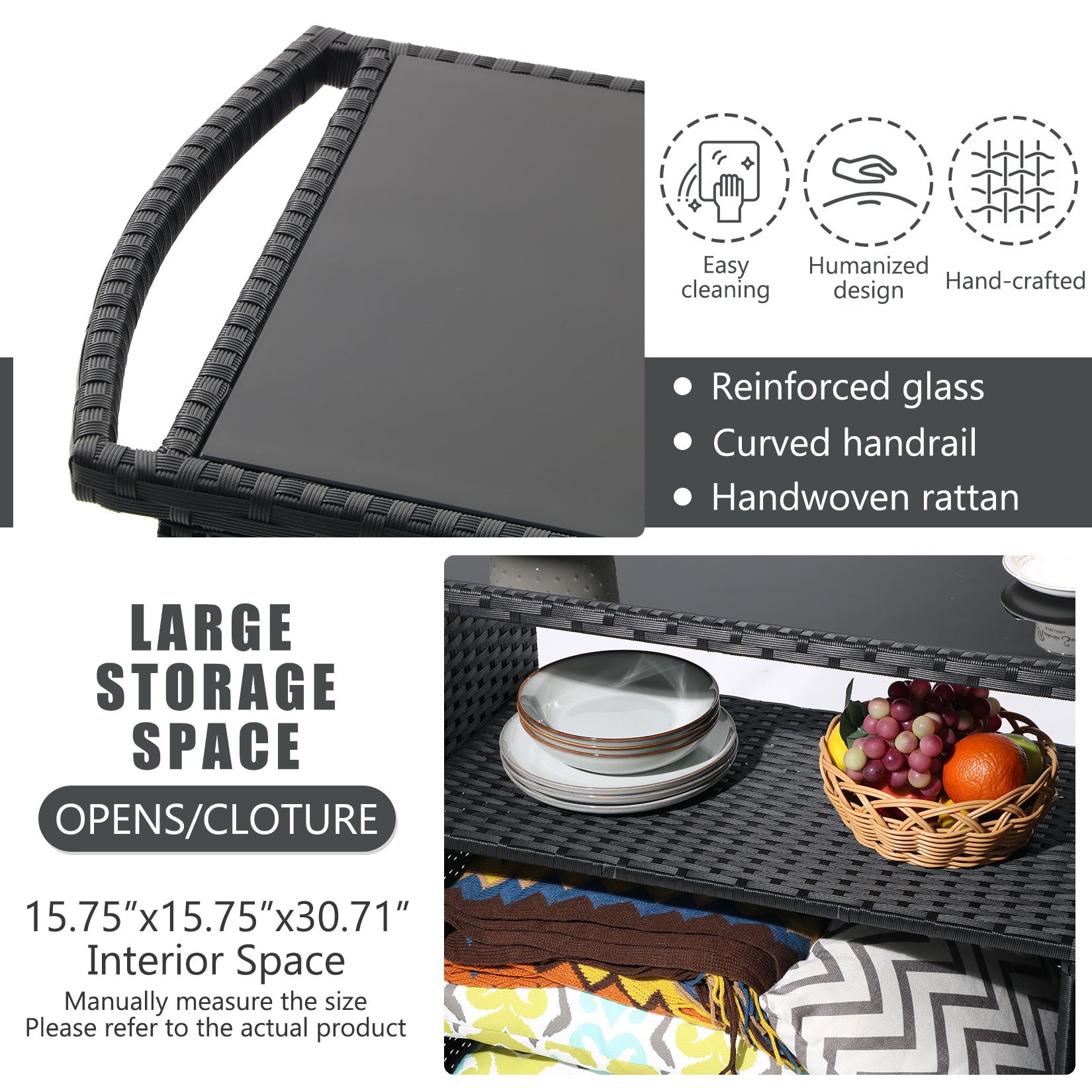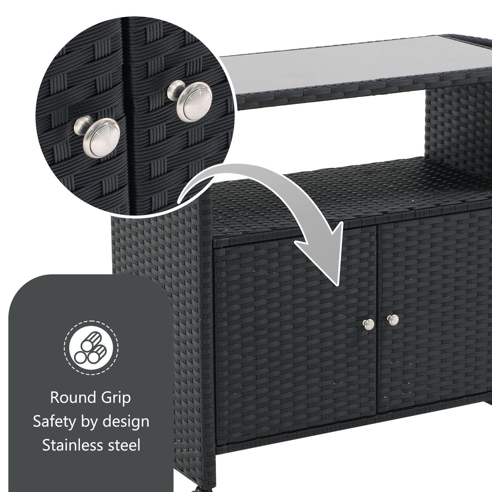 - 【Ample Storage & Stylish Design】Designed for convenience, this outdoor kitchen island offers a spacious tempered glass top and a two-tier storage area, perfect for organizing grilling tools, utensils, and seasonings. The PE rattan weaving adds a touch of elegance to your patio, lawn, or garden, blending functionality with style.
