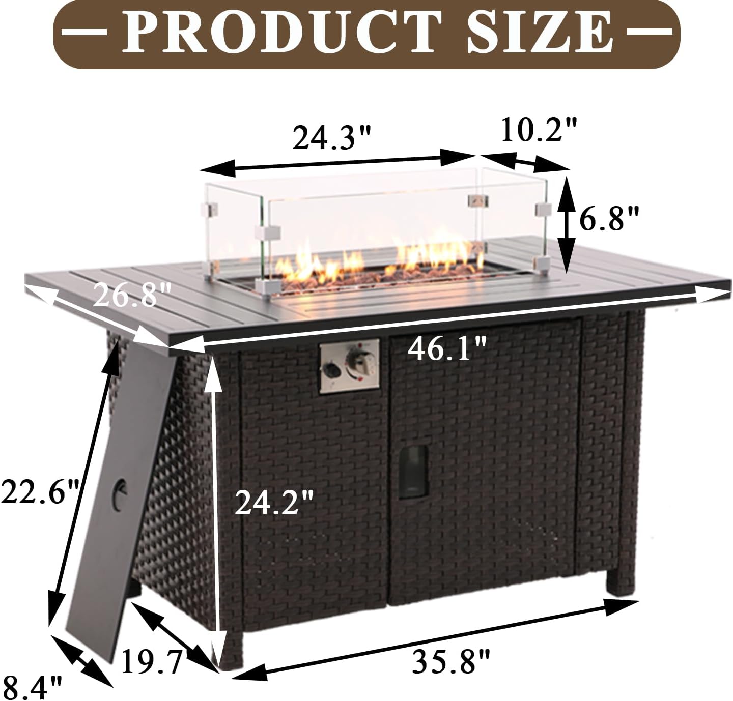 - 🔥Comfotable size and package: Patio furniture fire pit table dimesions: 46.1"(L) x 26.8"(W) x 24.2"(H). Outdoor fire pit table brings relaxing and comfortable life and modern style to your outdoor space. Content package includes glass wind guard, tempered glass, lava decorative rock set, and hardware bag. Patio fire pit table will be shipped with one box. Please be patient.
