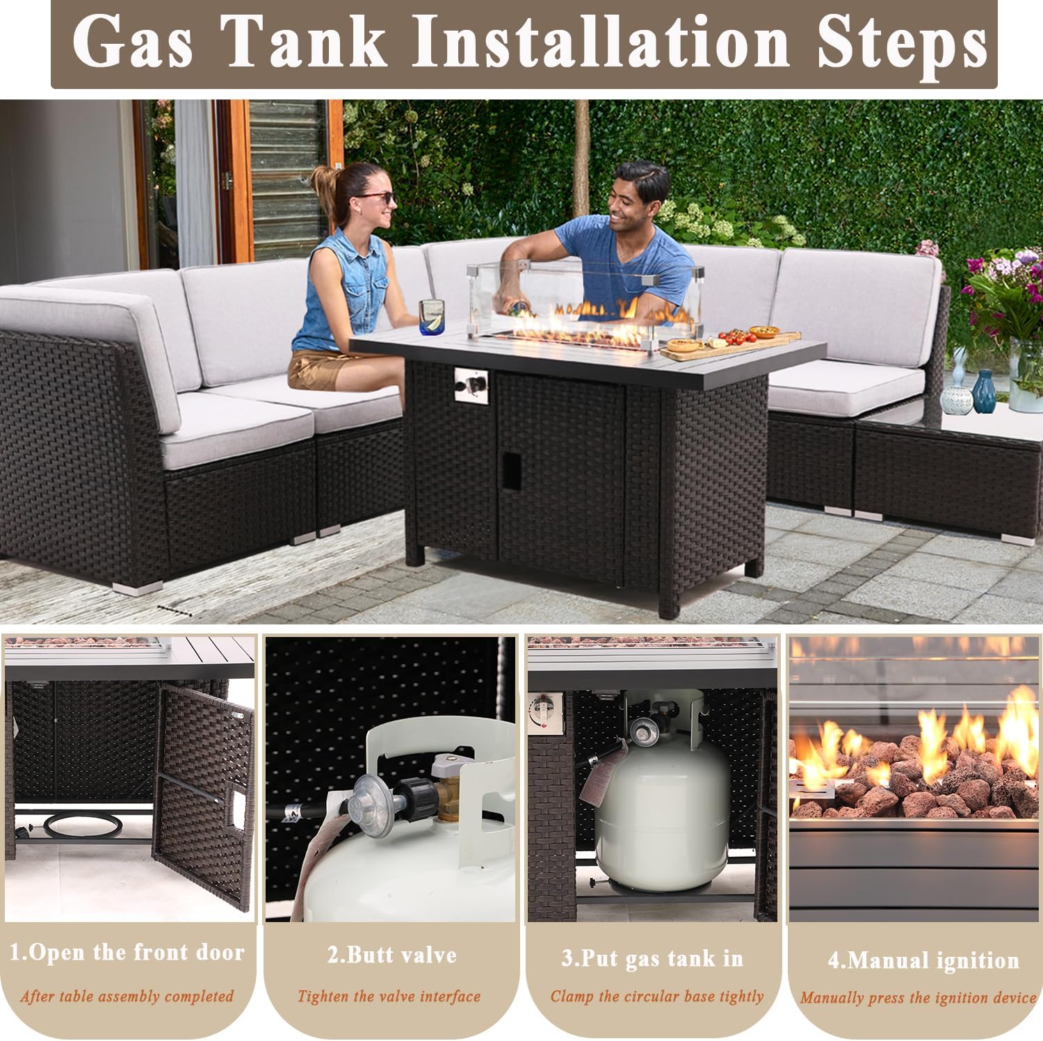 - 🔥Gas fire pit table: Equipped with a high-efficiency burner, integrated push-button ignition, fire pit is easy start and flame height adjustment, and heats up to 55,000 BTU. Crafted with a gas tank holder, you can change your propane tank conveniently. It works with a standard propane tank. You can measure the size of propane tank before purchasing the table. Gas fire pit table has a widened tabletop and is free switch from fire pit table to flat intact coffee table.(Propane tank not included)