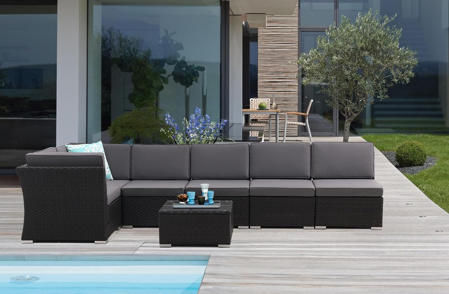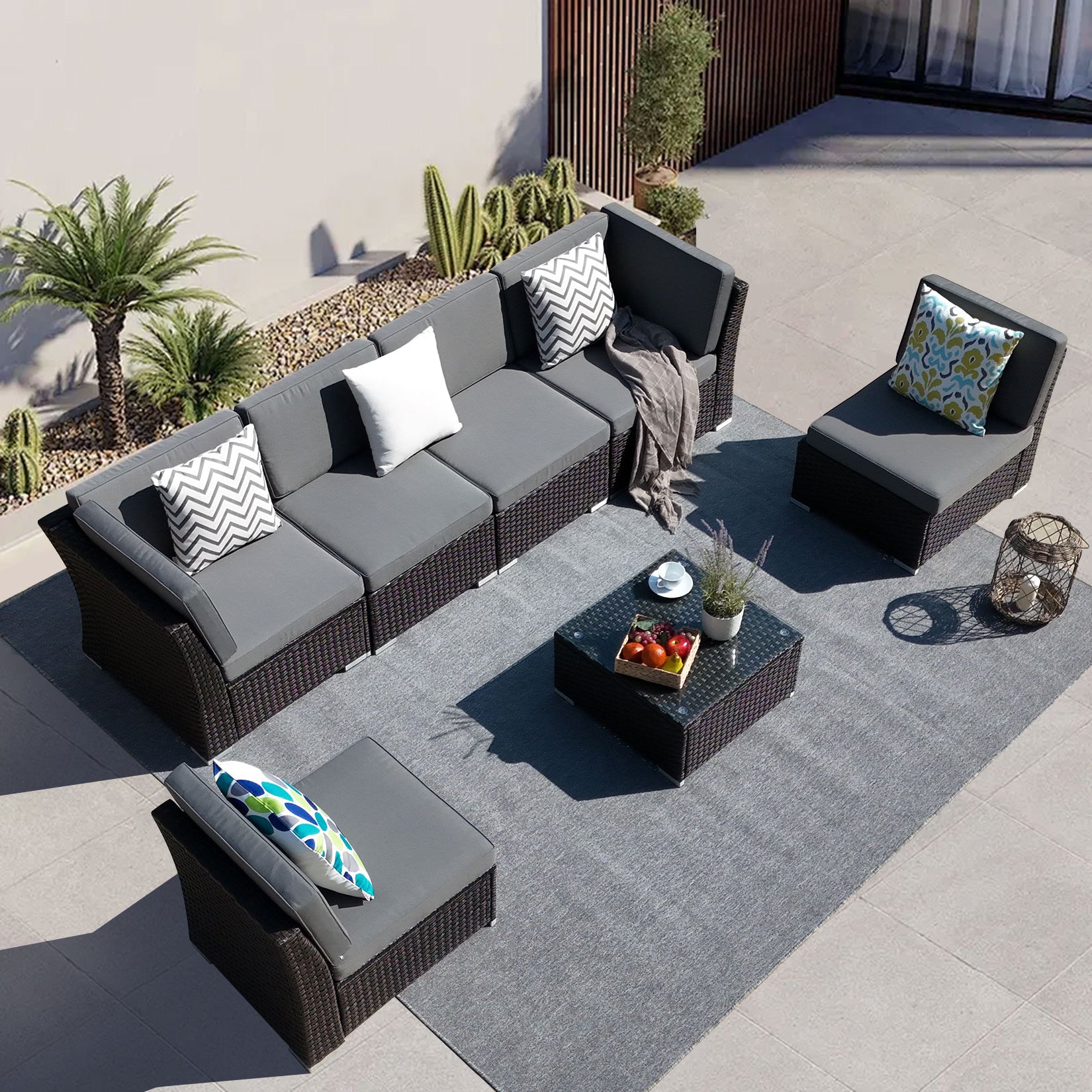 - 🛋️Package and Multi-combination: 7 pcs patio furniture set includes 4 armless sofas, 2 corner sofas,1 coffee table with a tempered glass top, 6 seat cushions and 8 back cushions. This moveable and sectional design allows it to adjust a required combination and change to different shapes for seating or lying. You can combine the sofas freely.