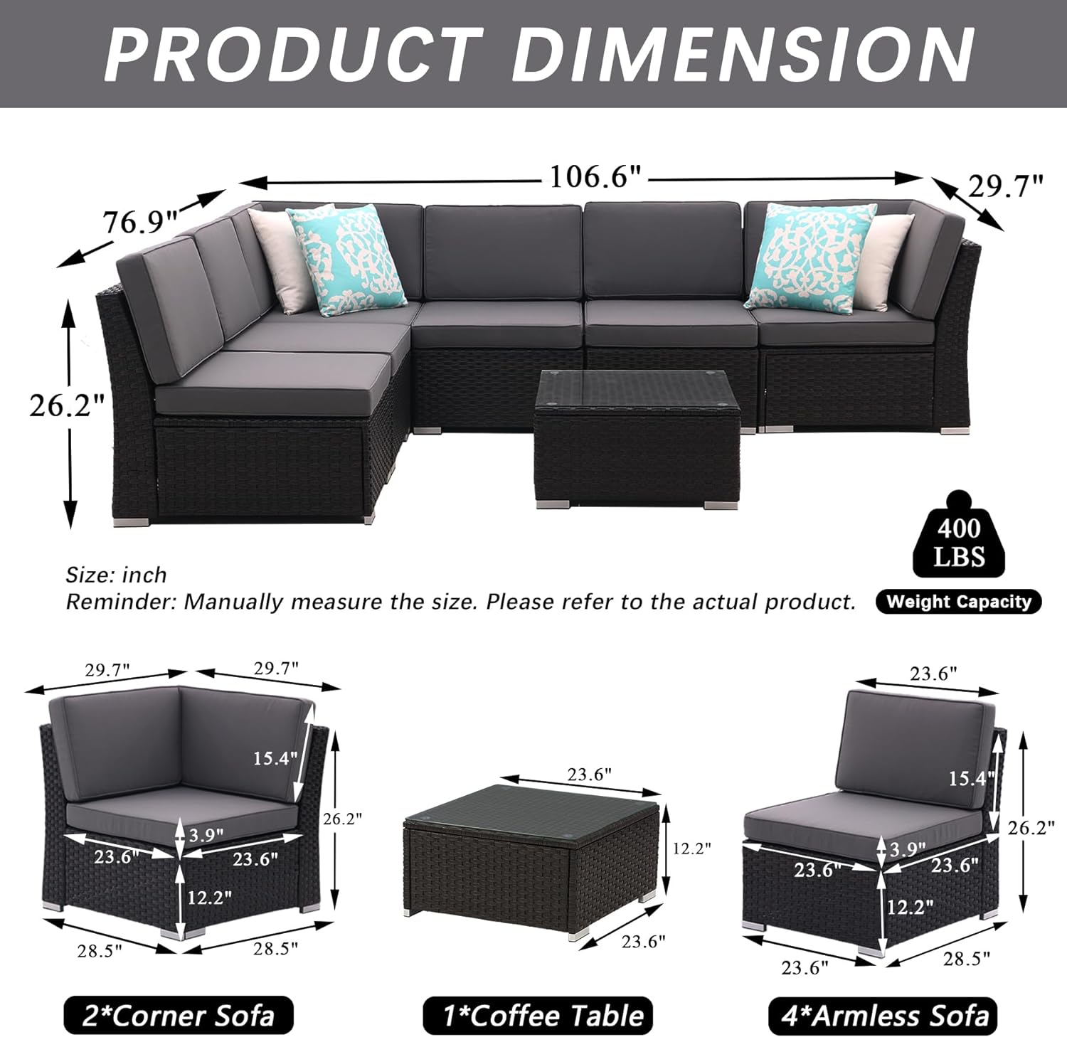 - 🛋️Comfotable Size and Big Capacity: Armless sofa dimesions: 23.6"(L) x 28.5"(W) x 26.2"(H). Corner sofa dimesions: 28.5"(L) x 28.5"(W) x 26.2"(H). Patio furniture coffee table dimesions: 23.6"(L) x 23.6"(W) x 12.2"(H). Patio couch has a 3.9" soft seat cushion, and the height large backrest is 26.2". Each sofa Max capacity is 400 lbs. Outdoor sofa set brings relaxing and comfortable life and modern style to your outdoor space.