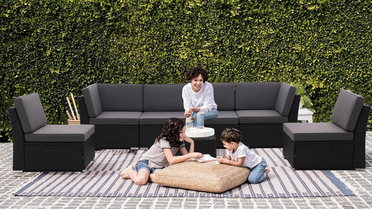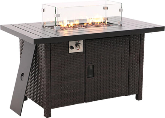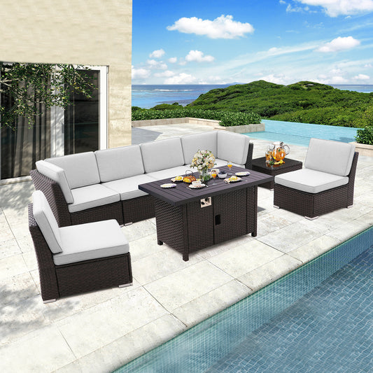 8 Pieces Patio Sofa with Gas Firepit Table and Tempered Coffee Table